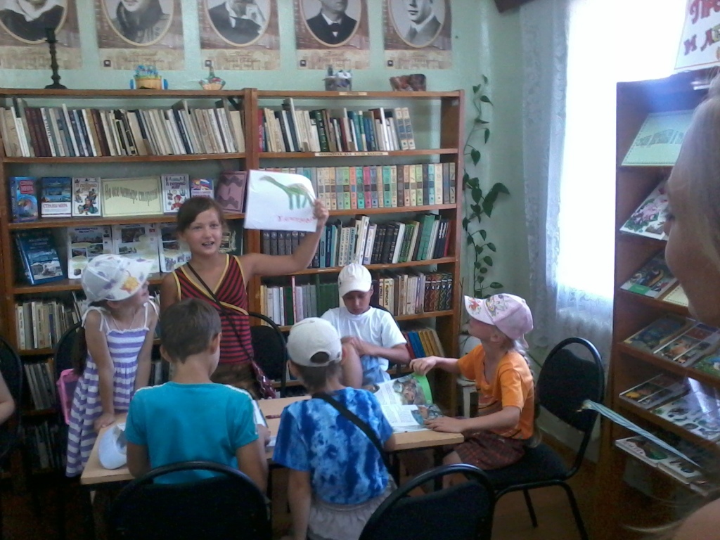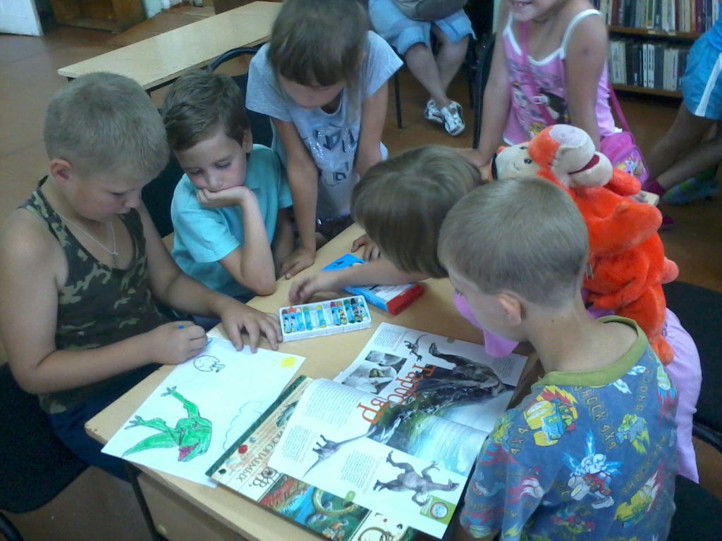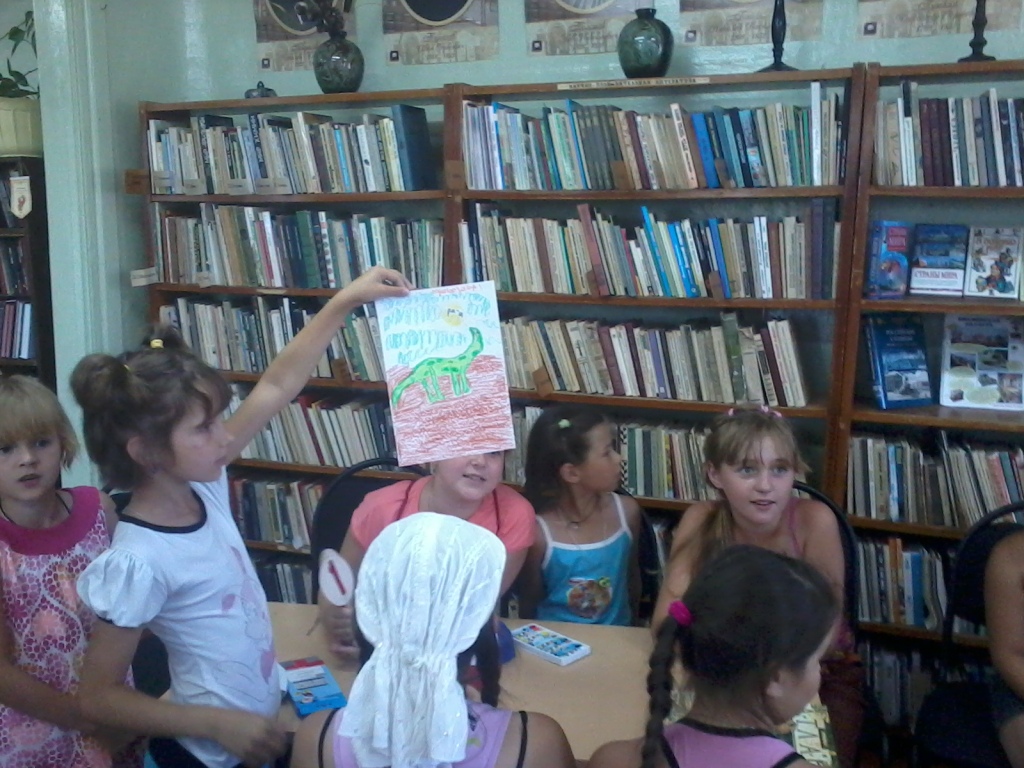 Ребята приняли участие в интеллектуально — познавательной игре о динозаврах «Гиганты прошлого». Эта тема всегда интересовала наших читателей и поэтому ребята быстро и с удовольствием отвечали на вопросы ведущего. А последним заданием было нарисовать динозавра.