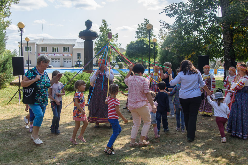 На смену специалистам Центра культуры и искусства, показавшим театрализованное представление, пришел «образцовый» детский фольклорный ансамбль «Весёлые потешки» из Дома культуры д. Беласовка со своим руководителем А.А. Зиновьевой. Ведущие вместе с гостями праздника водили хороводы, пели частушки, с помощью танца «пекли» яблочный пирог, воздавали хвалу яблочкам, называли их сорта. Интересно прошел игровой блок «Угадай мелодию», где взрослые и дети узнавали и исполняли хором знакомые песни. Очень смешно проходила игра среди детей, где без помощи рук надо было съесть яблоки, висящие на ниточке. Дети называли любимые сказки и мультфильмы, где упоминались яблочки, а конкурсное исполнение частушек на яблочную тему привлекало внимание прохожих, заставляя улыбаться и радоваться празднику. С особой радостью бабушки и дети «выдавали» шуточные частушки, пританцовывая под весёлые наигрыши. Пословицы и поговорки про яблоки, названия вкусных кушаний из этих плодов слышны были с разных мест. За правильные ответы всем вручали медали в виде яблок со словами «Яблочный спас». Гостей праздника закружила и подружила «карусель желаний», всем хотелось, чтобы, загаданная под весёлые народные наигрыши заветная мечта, обязательно исполнилась.