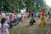 Центральная площадка сквера превратилась в волшебный лес, в котором происходили загадочные события. Коварный Соловей-разбойник похитил плоды с Чудо-яблони, а Василиса Премудрая в компании Бабы Яги и домовенка Кузи, вместе с юными гостями прошли сложные испытания на ловкость, скорость, меткость и остроту ума, чтобы вернуть символ праздника В итоге, злодей перешел на сторону добрых героев и торжество вернулось в сказочный лес. В финале пути всех встретила Яблонька Антоновна и подарила огромное яблоко, наполненное сладкими призами.